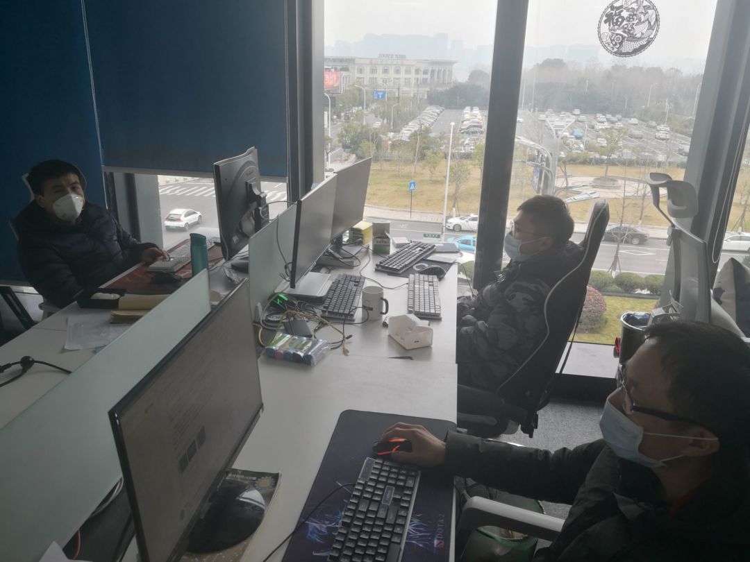 最后面的木头柱子那里那个带口罩的是长阳(古代的资深玩家,现任客服同学)他前面这个是美术同学,负责做特效的(游戏内所有的特效都是他做滴)
