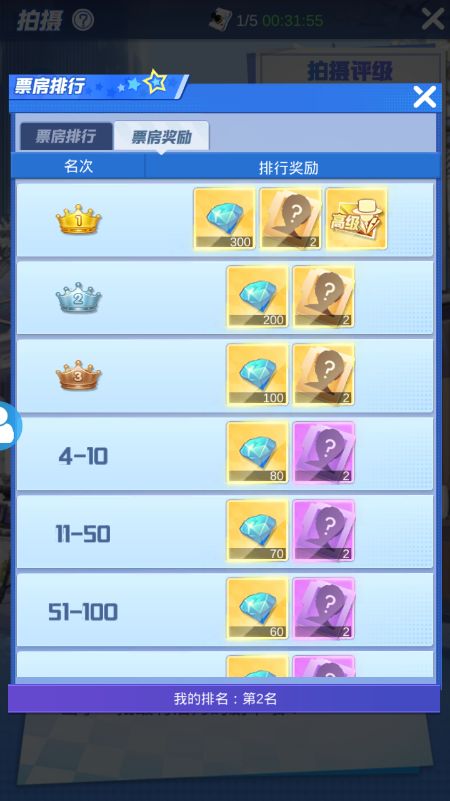 1、票房榜。一般是按实力榜的映照比较固定,如果实力接近,你可以根据实际情况卡下每天的拍摄次数,比如我第二名,每天就盯着第三名,如果他跟我差距较大,我当天就多留几次次数等明天再拍,如果差距比较小就不留次数(平民不推荐购买次数),拍摄次数5小时增加一次,能保留5次。