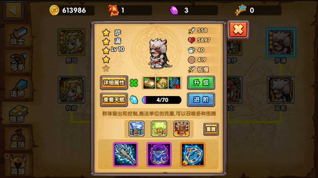 配置:4星10级初心萨满,4星10级牙刺火法,满贷款小偷,10级大锤有橙武最好,镜影镜子圣骑。