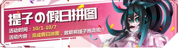 10/1-10/7,只要完成每日任务,翻开拼图,就可以得到超可爱神启组萝莉提子,让荔子与提子双生相遇!更有提子的假日拼图册,收集限定图集就可以拿到特别奖励哦ヾ(≧▽≦*)o