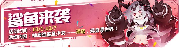 10/1-10/7,神启组巨鲨少女泽塔酱首次现身源世界,异世界饲养鲨鱼的双马尾少女,在甜美的声音下有着什么样的野心呢!快来蛋池抓住这只黑色的鲨鱼吧,揭开她背后的故事吧。活动期间,泽塔蛋池获取概率限时up!