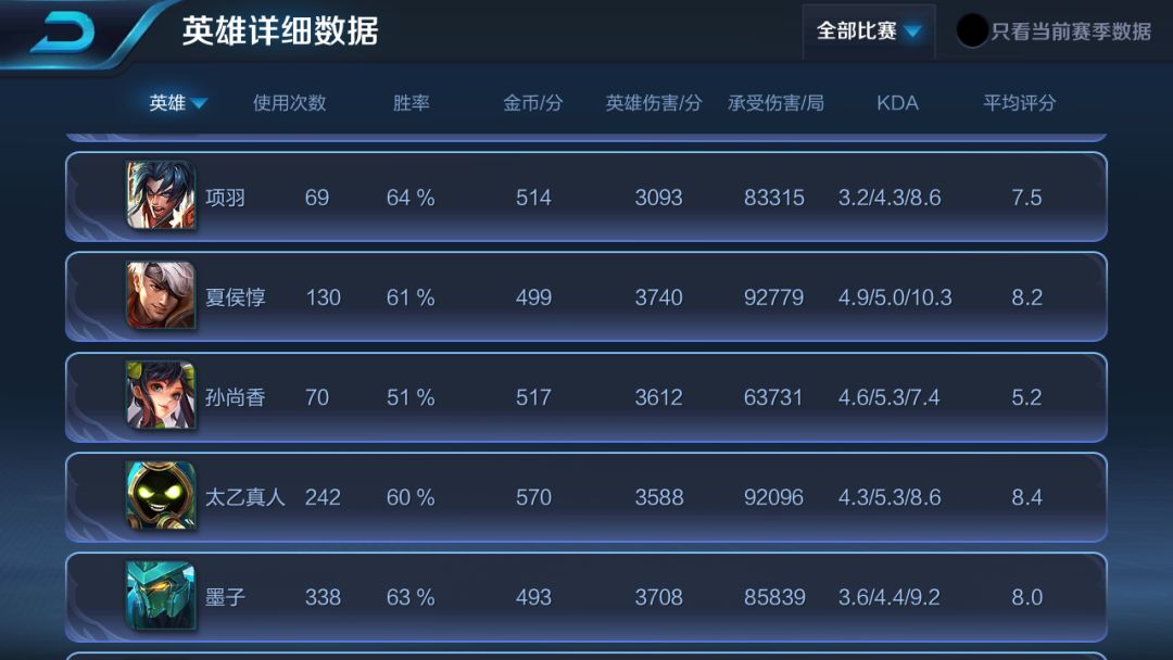 战绩数据问题: 不错! 本楼主骄傲滴说,我这个墨子就是个混子!!! 详见KDA页面,完全就是辅助的KDA么…原理技术就是大招是护身用的,不到关键时刻绝对不冲上去开团,蹲在后面就行,而这么做的原因是墨子是全王者唯一一个远距离开团手,同时拥有很强近战能力的法师(别跟我讲钟馗,那钟馗近战有墨子强吗,CD那么长也影响了开团的速率)。例如项羽牛魔之流都需要冲到对面人堆里才能打出控制,而墨子蹲在后排丢技能就可以,控住C位了前排刺客走上去就干掉了,真是美的要命。