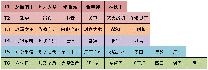 以下为《皇家奇兵》给各位玩家朋友列出的英雄资质排序,主要的分6个梯队,从T1到T6,T1是最强最好资质的英雄,从上到下,依次递减;
