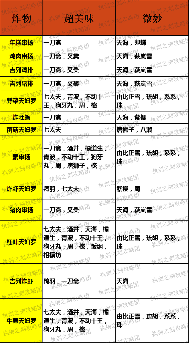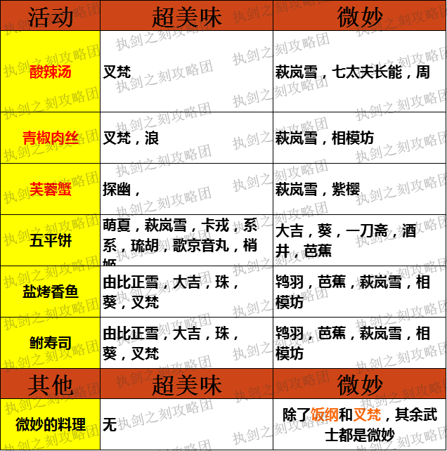 应部分小伙伴的需求,本次攻略在武士种族为单位的基础上,新增料理分类(点击看大图)。
