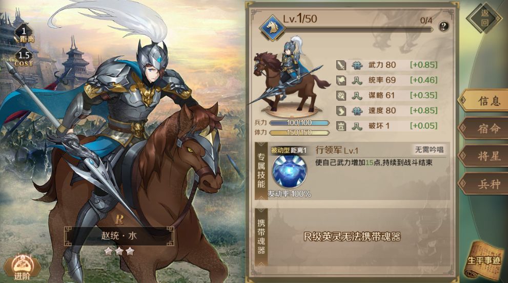 建议给他戴上前三回合为我方减伤和其他回复类魂器,然后放在骑兵队的中军,后期也可以作为铺路队使用。总结就是,辅助类性价比不错。