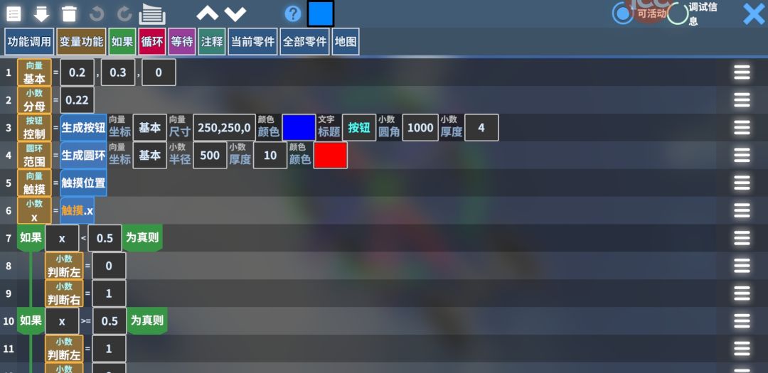 begincodeV1;name:摇杆;1:Vector3 基本=fun creatVariable.Vector3(Float 0.2:Float 0.3:Float 0);2:Float 分母=fun create.float(Float 0.22);3:UIButton 控制=fun ui.button(var 基本:Vector3 250,250,0:Color 0,0,255,255:String 按钮:Float 1000:Float 4);4:UICircle 范围=fun ui.circle(var 基本:Float 500:Float 10:Color 255,0,0,255);5:Vector3 触摸=fun input.touchPos();6:Float x=varf Vector3.触摸.x();7:if fun float.lt(var x:Float 0.5);8: Float 判断左=fun create.float(Float 0);9: Float 判断右=fun create.float(Float 1);10:if fun float.gte(var x:Float 0.5);11: Float 判断左=fun create.float(Float 1);12: Float 判断右=fun create.float(Float 0);13:Vector3 判定=fun input.touchPosByIndex(var 判断左);14:Vector3 判定2=fun input.touchPosByIndex(var 判断右);15:if varf UIButton.控制.pressing();16: Vector3 判定=fun vector3.minus(var 判定:var 基本);17: Vector3 判定=fun screen.toPixel(var 判定);18: Vector3 判定=varf Vector3.判定.limitLength(Float 200);19: Vector3 判定=fun screen.fromPixel(var 判定);20: Vector3 判定=fun vector3.add(var 判定:var 基本);21: =varf UIButton.控制.pos(var 判定);22: Float x=varf Vector3.判定.x();23: Float 使用x=fun float.division(var x:var 分母);24: if fun float.lt(var x:Float 0.2);25: =act 25./左.active();26: =act 25./左.setMoveForceRate(var 使用x);27: =act 25./左2.active();28: =act 25./左2.setMoveForceRate(var 使用x);29: if fun float.gt(var x:Float 0.2);30: =act 25./右.active();31: =act 25./右.setMoveForceRate(var 使用x);32: =act 25./右2.active();33: =act 25./右2.setMoveForceRate(var 使用x);34: Float y=varf Vector3.判定.y();35: Float 使用y=fun float.division(var y:var 分母);36: if fun float.gt(var y:Float 0.3);37: =act 304./前进.active();38: =act 304./前进.setMoveForceRate(var 使用y);39: if fun float.lt(var y:Float 0.3);40: =act 304./后退.active();41: =act 304./后退.setMoveForceRate(var 使用y);42:if varf UIButton.控制.isRelease();43: =varf UIButton.控制.pos(var 基本);44:/*if fun create.bool(Bool 0);45:/* Bool 限制=fun create.bool(Bool 1);46:/* Vector3 目标=fun camera.foward();47:Vector3 基本2=fun creatVariable.Vector3(Float 0.8:Float 0.3:Float 0);48:UIButton 控制2=fun ui.button(var 基本2:Vector3 250,250,0:Color 0,0,255,255:String 按钮:Float 1000:Float 4);49:UICircle 范围2=fun ui.circle(var 基本2:Float 500:Float 10:Color 255,0,0,255);50:if varf UIButton.控制2.pressing();51: Vector3 判定2=fun vector3.minus(var 判定2:var 基本2);52: Vector3 使用2=varf Vector3.判定2.copy();53: Vector3 使用2=fun vector3.multilply(var 使用2:Float 10);54: =act 1.this.addForce(var 使用2:Enum 0);55: Vector3 判定2=fun screen.toPixel(var 判定2);56: Vector3 判定2=varf Vector3.判定2.limitLength(Float 200);57: Vector3 判定2=fun screen.fromPixel(var 判定2);58: Vector3 判定2=fun vector3.add(var 判定2:var 基本2);59: =varf UIButton.控制2.pos(var 判定2);60: if varf UIButton.控制2.isRelease();61: =varf UIButton.控制2.pos(var 基本2);endcode