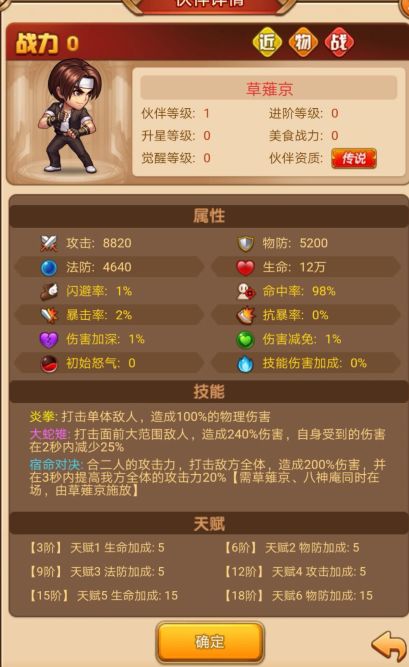 合体技能:合二人的攻击力,打击地方全体,造成200%伤害,并在3秒内提高我方全体的攻击力20%【需草薙京、八神庵同时在场,由草薙京释放】