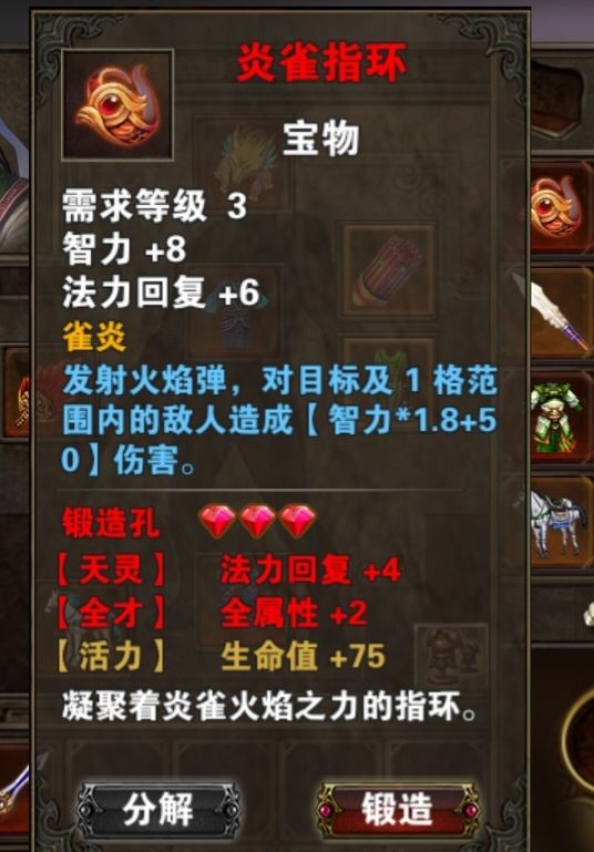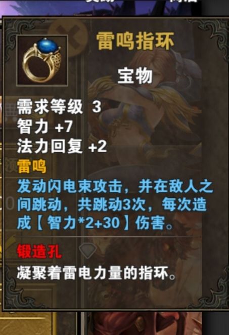 12.炎雀指环:充值性价比很高的装备,1级可用,三孔高智力,前期锻造智力亮技能远程群伤,后期锻造为回血回蓝,三孔理论上加上自带6法力回复单装备总共出18点回蓝,某些时候装备以后过天,回蓝嗖嗖的。