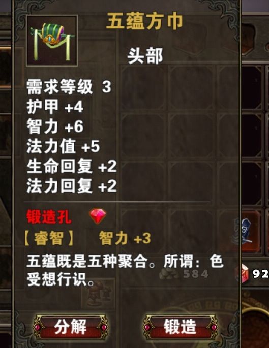 8.五蕴方巾:回蓝效果一般,还能少量回血,鉴于回蓝红装获取难度,推图时备几套这个应急也是必要的。