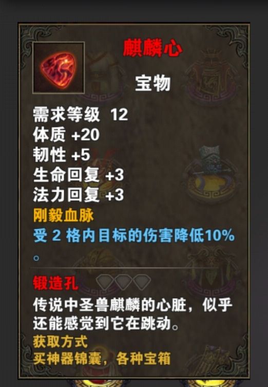 13.麒麟心:最容易被遗忘的回血回蓝装。超高体质加成,亮技能减伤又肉又耐操,还有回复,是个好东西。