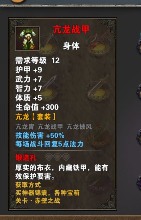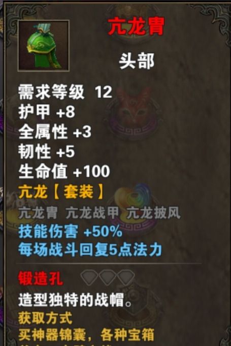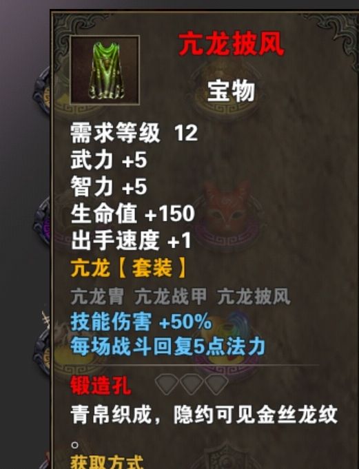19.亢龙套:俗称绿帽套,鸡肋的存在。全套家50%伤害效果中等,每场战斗加5法力值效果感人,综合来说没啥人会用。全套装备都可以通过打赤壁之战刷亢龙宝箱出,但绝对谁刷谁脑抽,有这功夫其他红装早刷了一箩筐了。