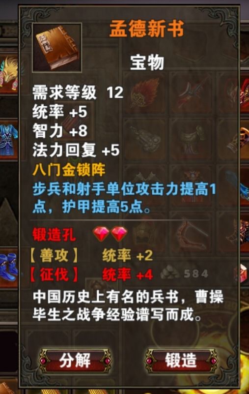 15.孟德新书:加智力统帅回蓝都是添头,这东西最最有用的是加射手和步兵攻击,配合白莲衣、紫法杖、白翎冠,刷过美人计或者赤壁的都说好。唯一遗憾就是特效“八门金锁”和赤莲衣重合不能叠加。