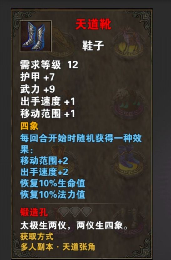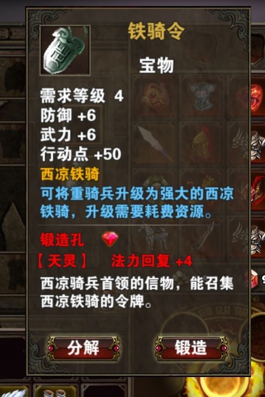 20.宝物里面铁骑令和六韬本来属于跑路装不带回蓝,但由于本身加移动力和宝物锻造能出回血回蓝属性的特质,这里特别提及一下。务必弄上2~4个双孔的,方便锻造出回血或回蓝属性,一般需要跑路赶时间的图,战斗大都比较密集,缺血缺蓝很多,每回合换跑路装时候顺便回血回蓝,绝对美滋滋不解释。