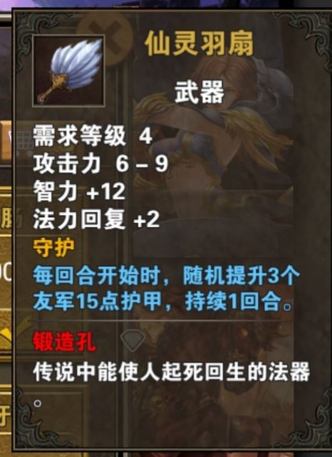 5.仙灵羽扇:高智力加成亮技能,首回合加兵护甲帮助存活,回蓝较少。前中期常用来亮技能,或者多武将出场红装不够配装用,属于过渡性装备。