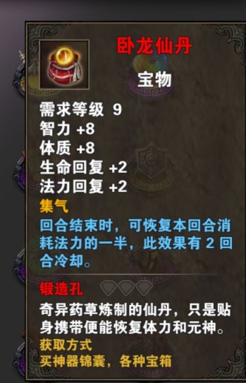 14.卧龙仙丹:加智力加体质少量回血回蓝,基本属性中规中矩,但每过几回合减少耗蓝的机制对于某些间歇爆发的耗蓝大户是个福音,使用范围略显局限,但也是个不错的东西。