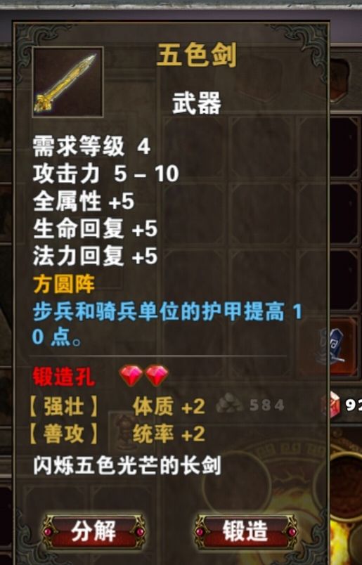 3.五色剑:黄装神器之一,回血回蓝各5,独此一家,还有全属性加5,步兵骑兵护甲,全能型存在,开箱子或者积分换三套(锻造否无所谓),推图回蓝绝对不亏。力荐!!