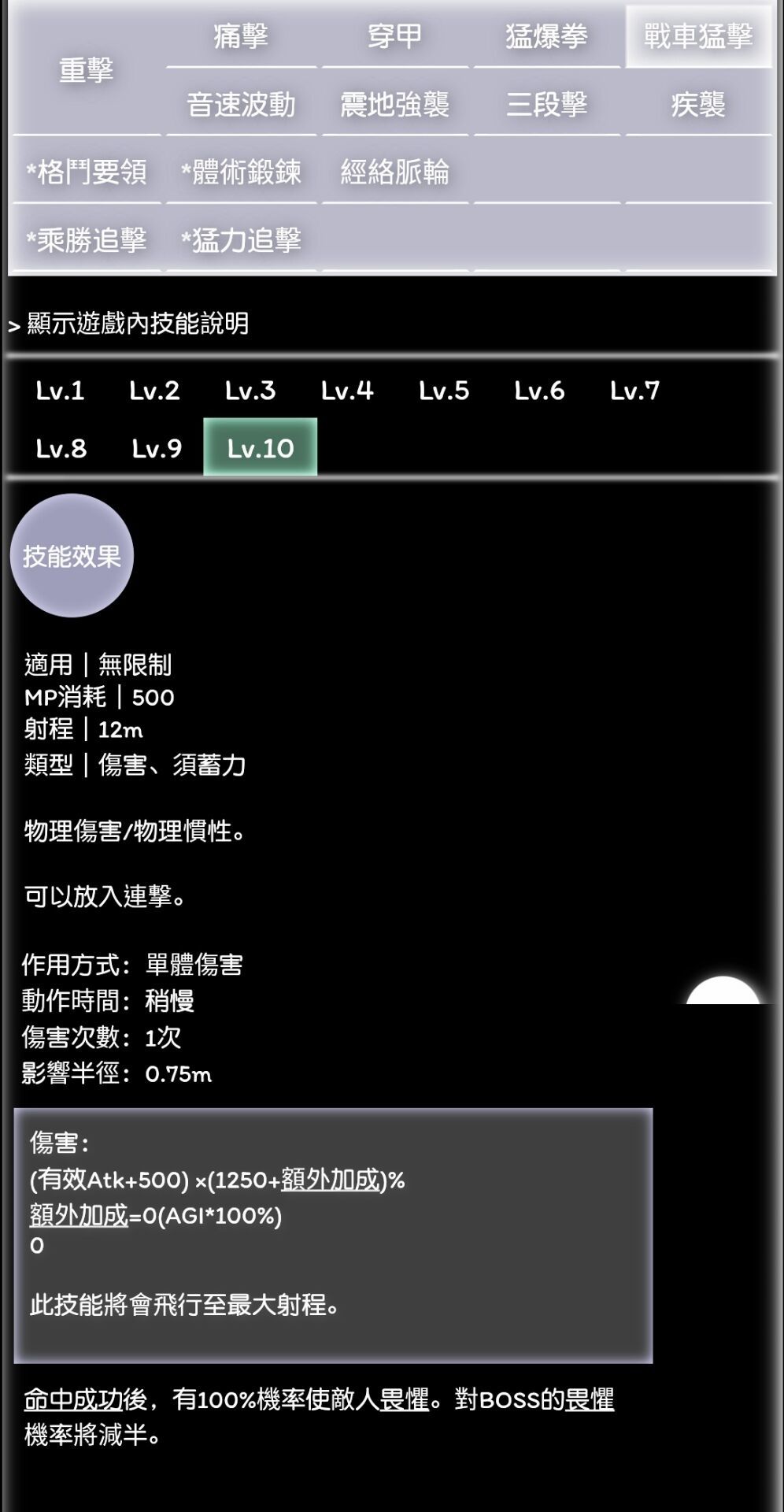 在戴拳套情况下10级音速是百分百翻覆,重击6也是百分百胆怯,穿甲和战车为主要输出