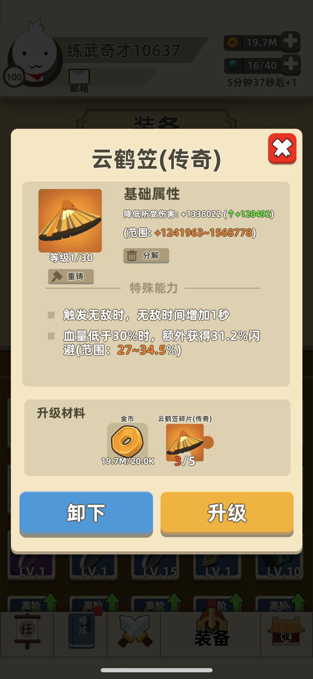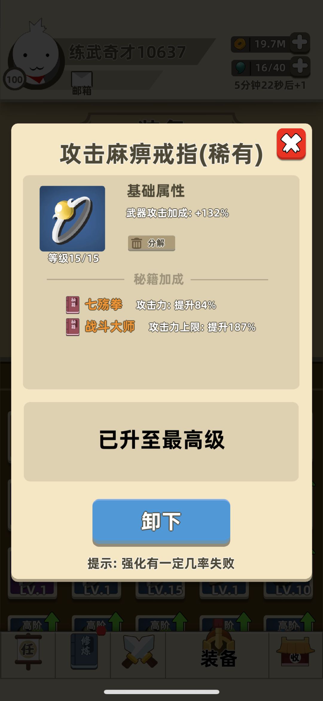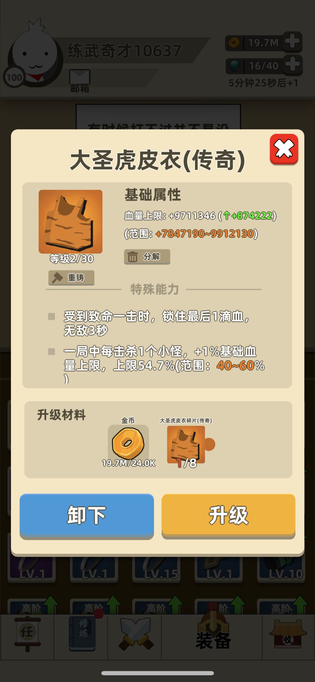技能我最后实在是没办法截图了,很紧张不敢暂停。开局选了攻击力。金钟罩,浩然正气葵花,七伤,战斗大师,功力大,功力小,暴击(这个很重要,大家知道我以前都是不选暴击的),生命大,飞剑,毒箭,会心一击,排山,隔山,背向。基本就是这样,最后过关面板是527M的攻击。