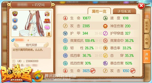 点开个人空间,转到资料页面,可以看到该名弹友的整体属性高低,完整覆盖了目前游戏内所有的属性属性,包括生命、速度、效果抵抗……通过对比,可以很直观地对比出与自身属性间的差距,究竟差在哪几项属性上,这样也方便自身对症下药,通过合适的方式寻求属性提升。