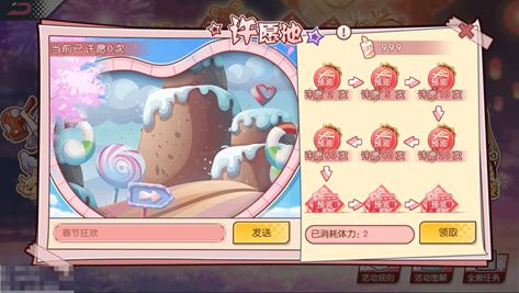 为庆祝新年送出祝福并许下愿望(限15字),许愿达到指定次数即可在页面右侧领取相应奖励,各种养成道具等你来拿~