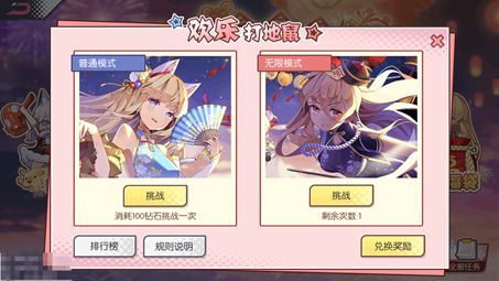 2、普通模式消耗100钻石进入挑战,每次挑战有一分钟的限制。普通模式挑战结束后,学长可以花费900钻石对本次的积分进行十倍翻倍,同时获取两次无限模式的挑战机会。