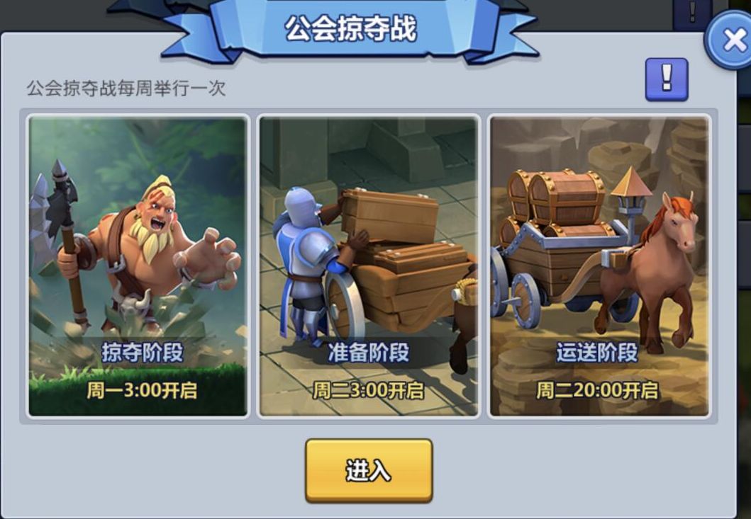 掠夺阶段(周一3:00开启)在掠夺阶段公会成员需要通过类似于英魂试炼玩法的副本中打BOSS,每位成员的伤害量相加,由伤害量总和决定活动结束后获得的奖励数量。