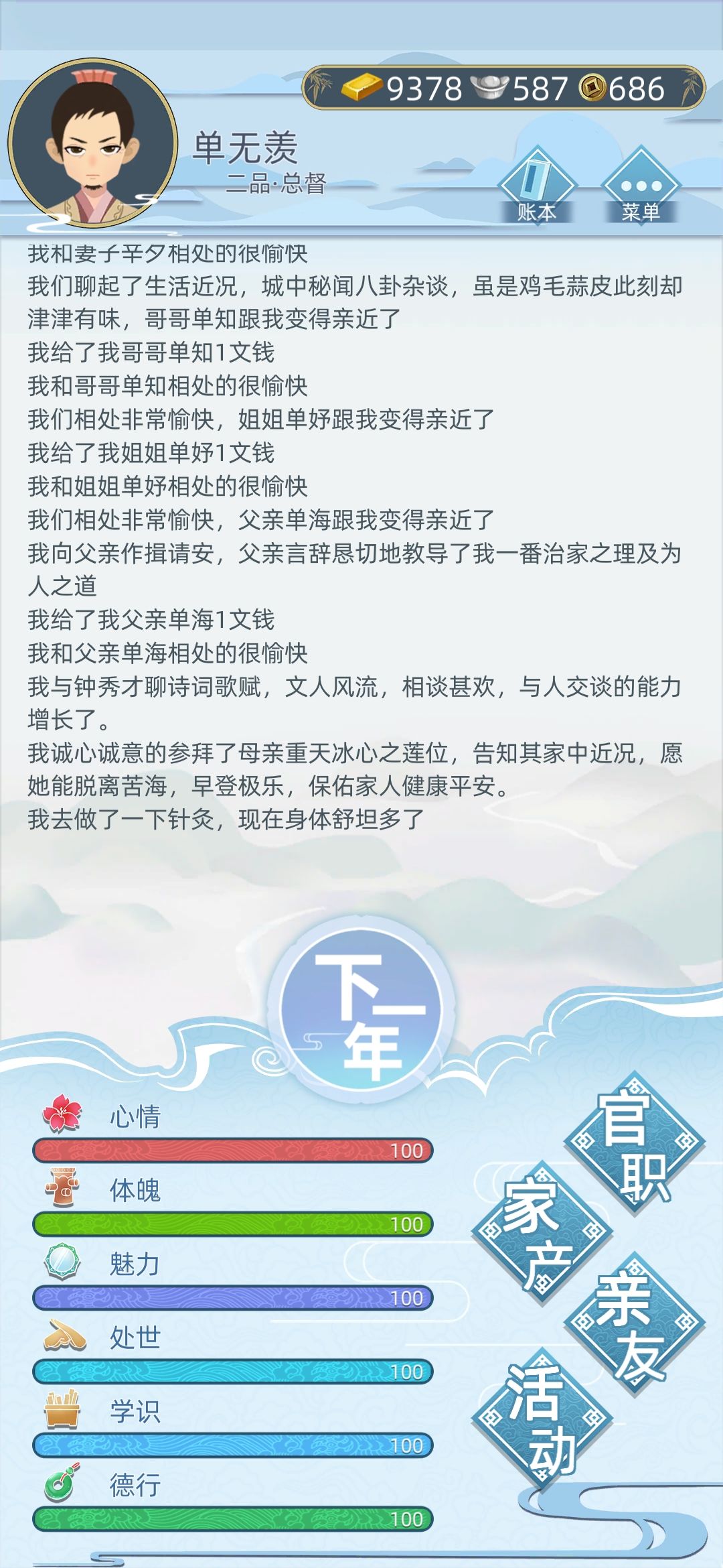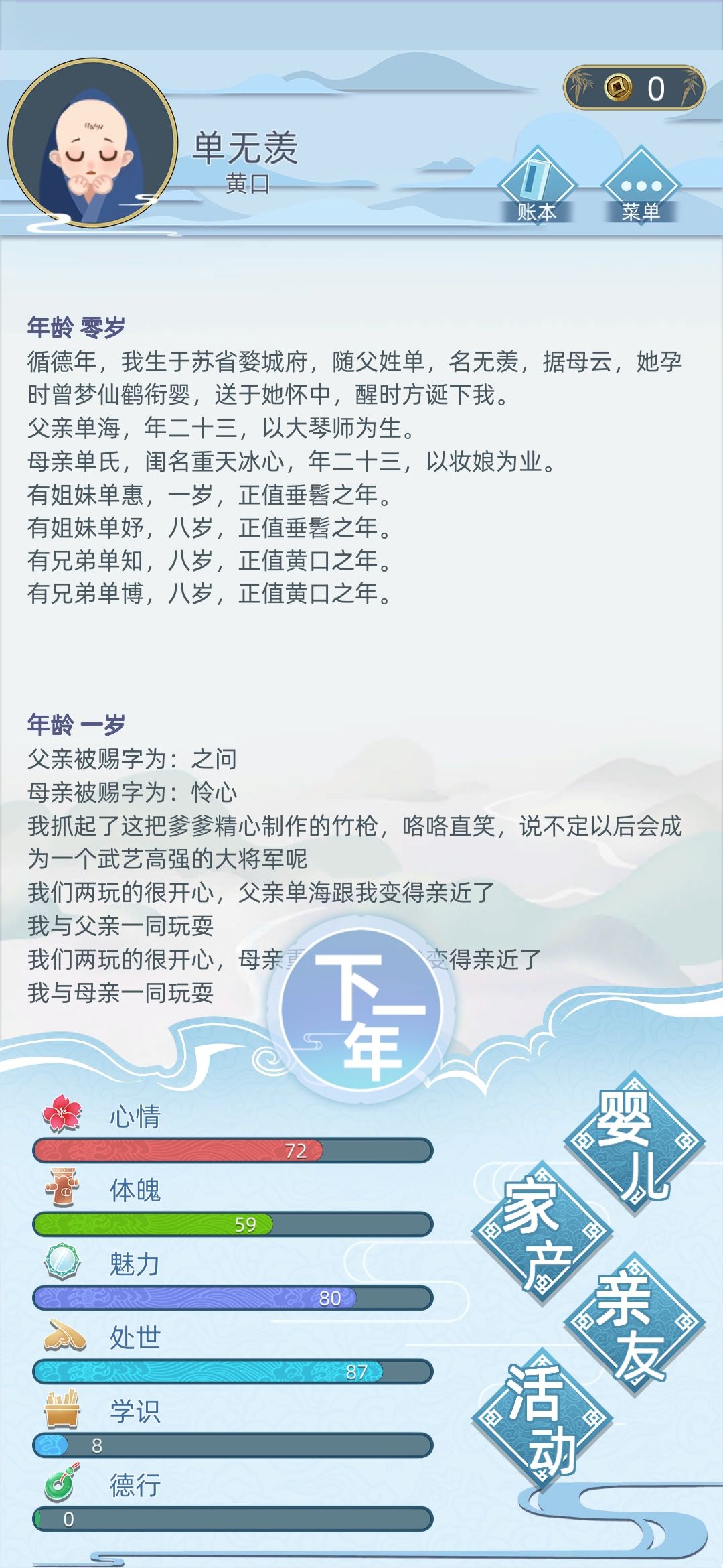 疯狂种田就对了,可以置办家产之前不用管什么属性,找父母要钱,抓促织卖促织就对了,先把经济搞上去,非要加属性的话每年就大堂找人聊天,寺庙参拜。