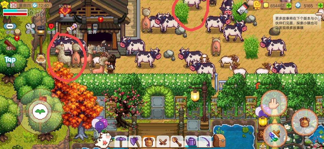看图,左边红圈里面有两只羊驼,一只有毛一只没有,有毛的可以用剪刀剪。上面的红圈里看牛牛的肚皮,“胸”下垂的可以用桶收集。