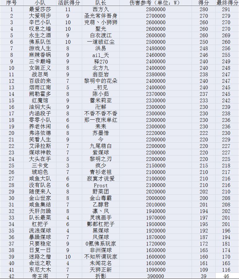 另外有需要留名的可以评论,这个表格是我在10月30号做好的。中间问过一些大佬。他们大部分表示只要活跃就行了。如果上面没有你的小队,可以自行拿上面的数据做参考。