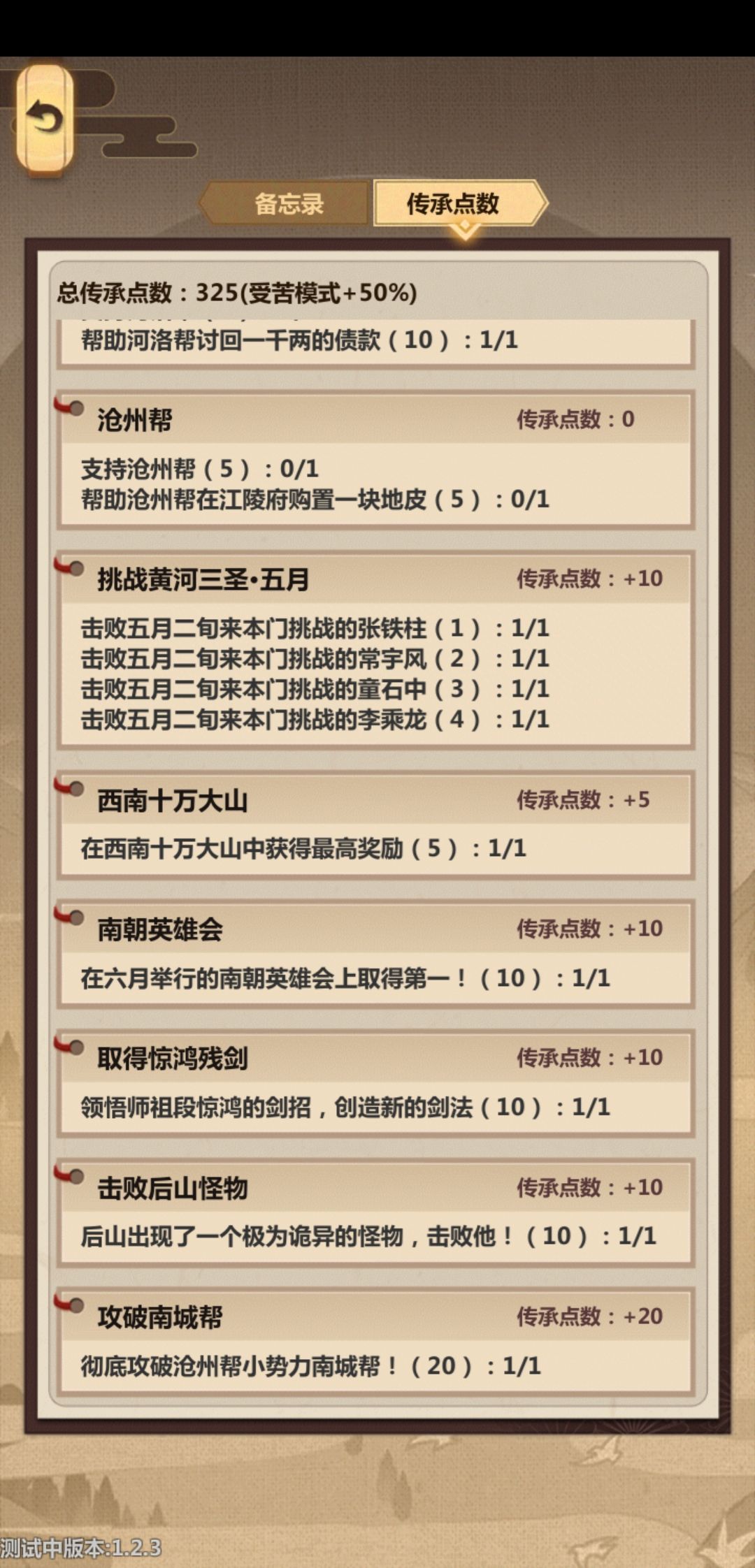 刚回门派前几天很关键,升级大殿,升级床。升级矿洞,升级马车。我最后还是弄不到更高的成就点了,有大佬指点一下么。感觉能弄的都弄了,