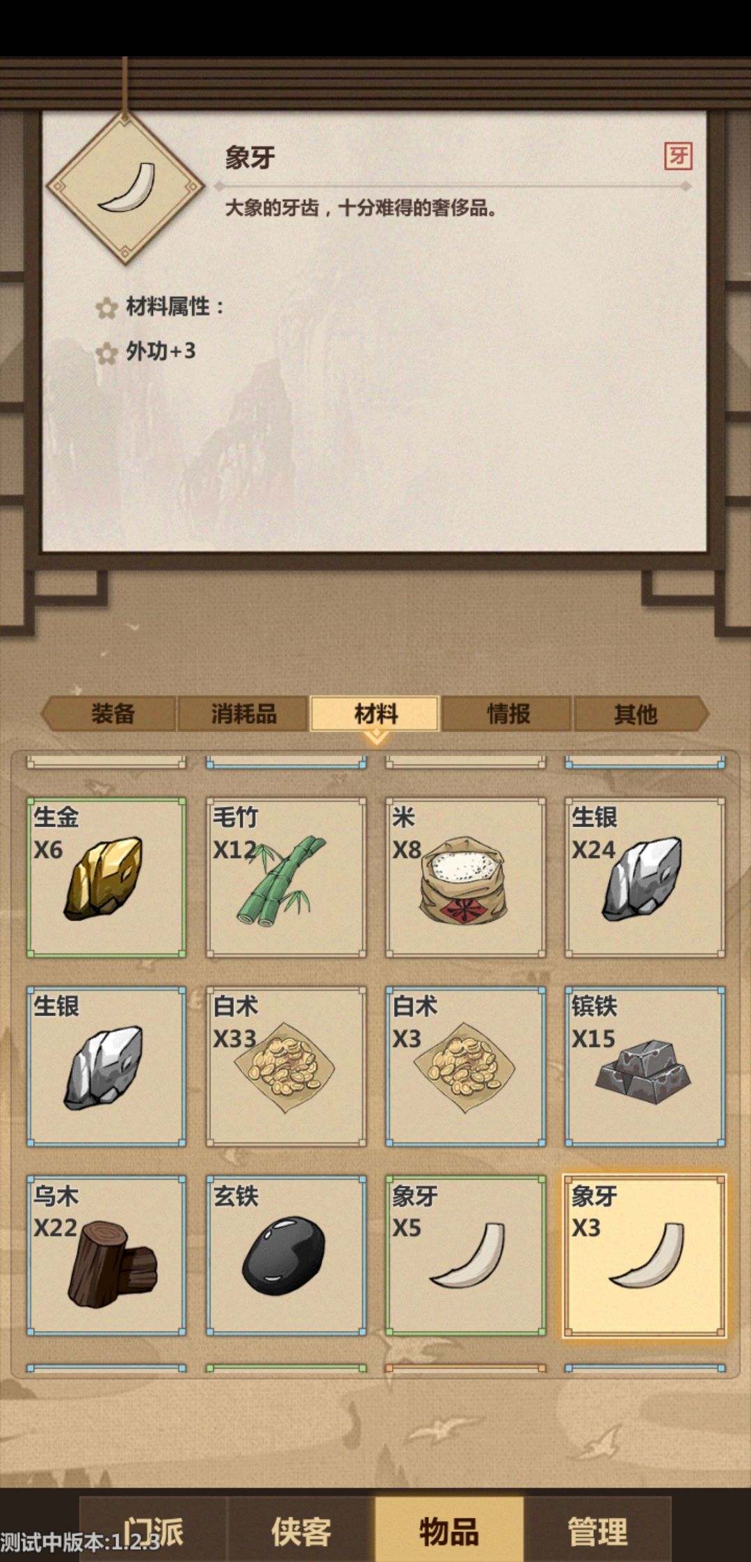 4各种工具人只要丁级弟子基本够用。后山采集,门派大殿公务,账房,赌场打工,村子采集,江陵城乞讨(减声望和心情)卖艺。5装备当面就是要抓紧前期地图上的商人,买橙色材料。不建议裁缝,做不出来什么好东西,养个工匠就可以了。金刚石,乌布,冷钢。
