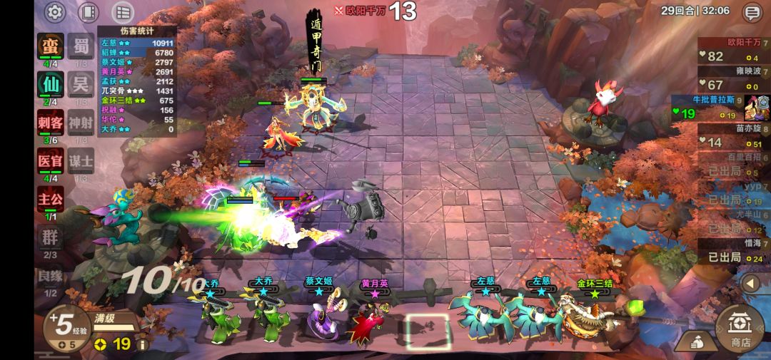 前期用骑士射手阵容过渡(射手毕竟强,但是有很多人玩),有卡拿卡。因为这套阵容前期强度不够所以只能卖血保经济,每波打野后优先升级白嫖(没有橙卡吃经济),保50块经济吃利息。南蛮有血有奶做前排能抗能奶,大乔华佗奶量十足只要不死打完还是将近满血。医师加攻速免伤正是刺客输出或者奶妈奶的关键,刺客随便浪。刺客有二星可以打没必要刻意的追三星,能有最好,没有照样输出爆炸。核心左慈输出装全给最好有一到两件减cd装,配合技能输出破万很轻松,因为医师华佗和左慈有减20%cd羁绊。左慈技能闪避加攻速输出非常爆炸,蓝回满基本无缝连接技能,想想别人打不着你还越打血回的越快,一个回合下来左慈血都是满的,又恶心输出还爆炸。只要前排够顶,后排刺客收割简直不讲道理。这套阵容只要能成型,吃鸡或者前三还是没问题的。