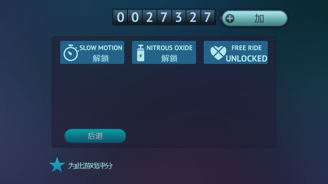 店里面可以解锁时间变慢($20000),氮气加速($50000),无限生命($100000)