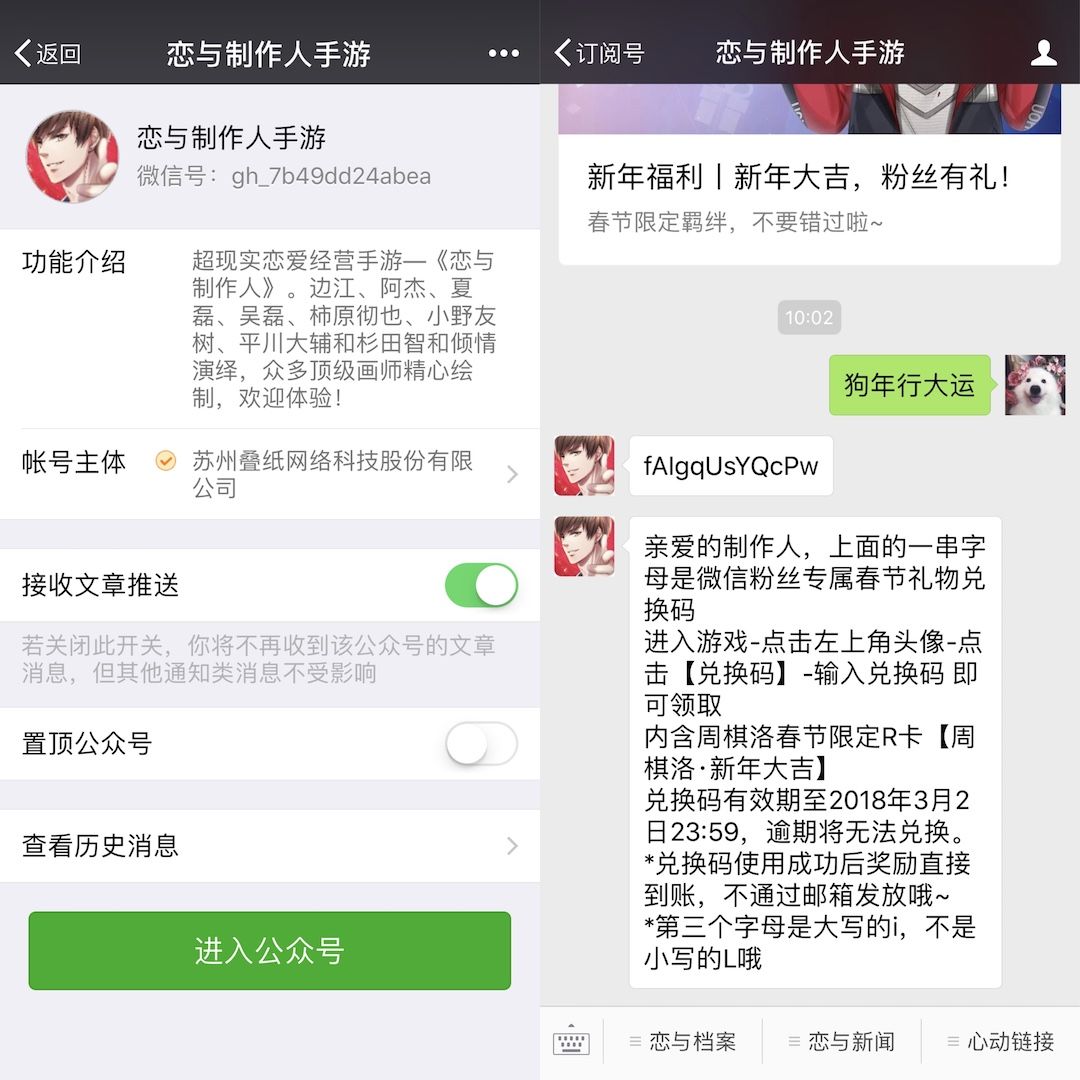 2、公众号对话栏回复关键词【狗年行大运】,即可收到一个专属兑换码,按照回复中的提示前往游戏内使用,即可领取你的新年专属礼物啦~