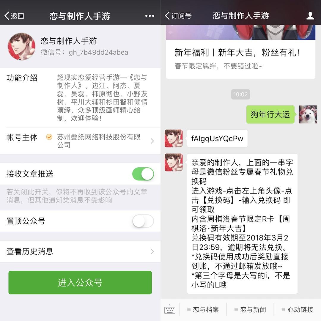 1、关注“恋与制作人手游”微信公众号