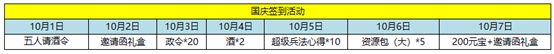 国庆期间为各位主公额外送上了国庆签到好礼!奖励好到炸裂有没有!!各位主公岂能错过!记得每天登录领取哦~