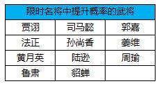 2)活动期间“限时名将”中的部分武将获得概率将大大增加,增加获得概率的武将详情如下。