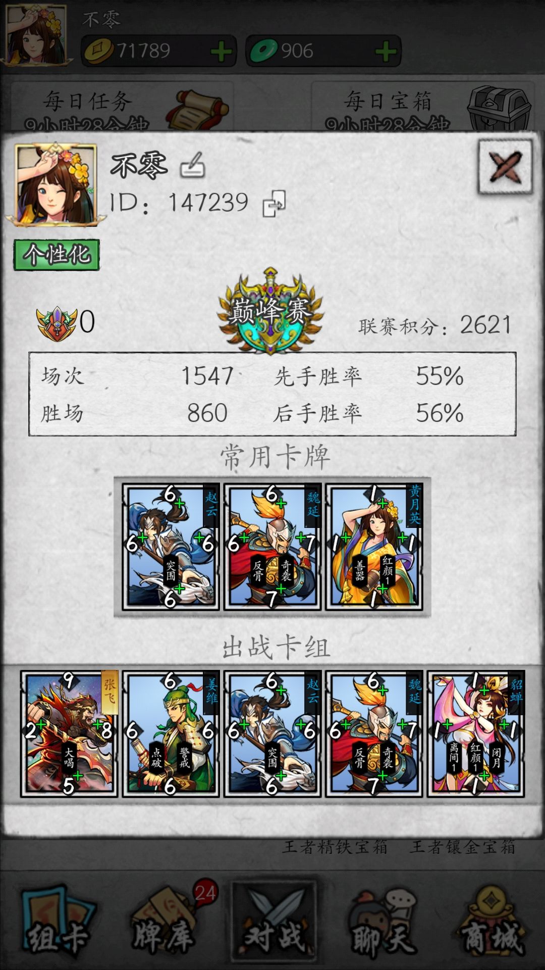 目前打到区排行榜第六(写攻略这会已经掉到区第七,世界第十二了),氪了六元买了貂蝉后,不断测试卡组终于上手貂蝉了,目前用的卡组是:sp张飞,胃炎,赵云,姜维,貂蝉。本帖主要目的是帮助萌新掌握思考对局的方法,不一定要用楼主的卡组,楼主的卡组也不算T1级别的,完全可以使用自己喜欢的国家和卡组。优势局就不贴了,主要是贴一些楼主在逆风中的微操翻盘。