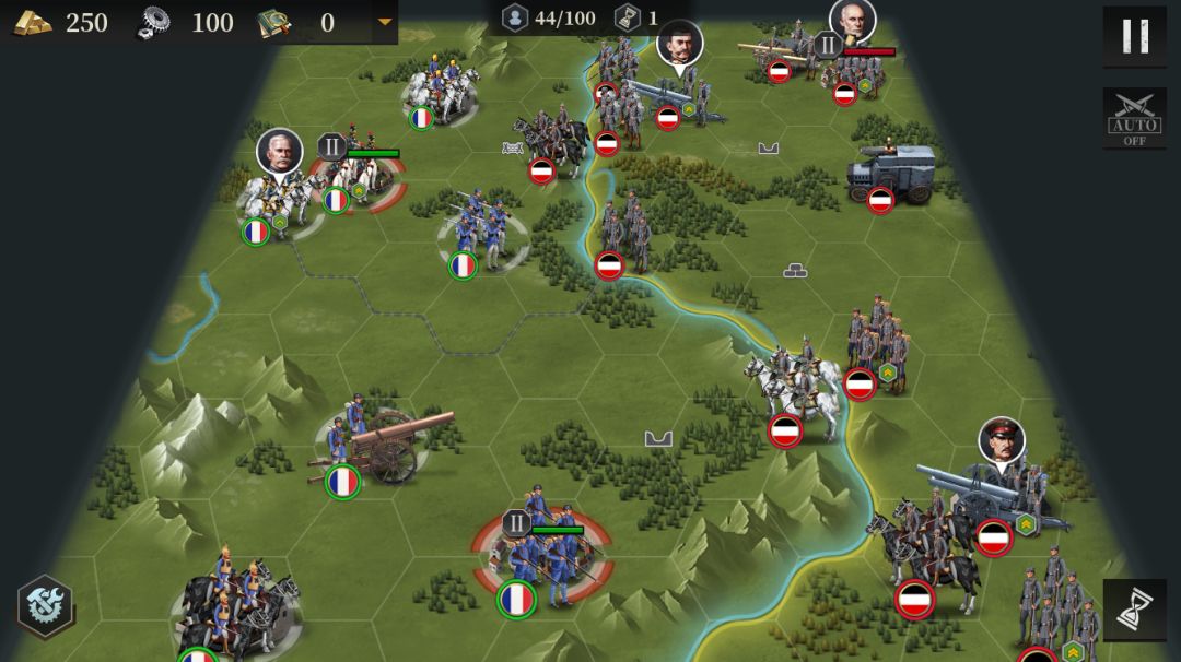 第一回合,老近卫和新式步兵上将,野战炮和胸甲骑兵也上将。野战炮先帮助清上方的敌军,同时,上方红圈城市升级为3级城,造小要塞在城市和马厩中间。
