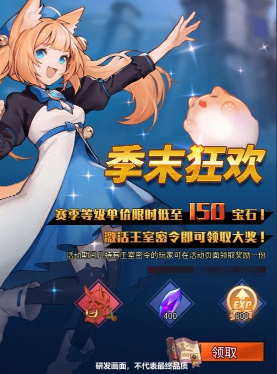 在赛季结束前,购买过本赛季王室密令的冒险者可以前往活动页面领取精美奖品(鬼面罩×1,宝石×400,赛季经验×600),活动期间激活王室密令的冒险者也可以获得哦~~