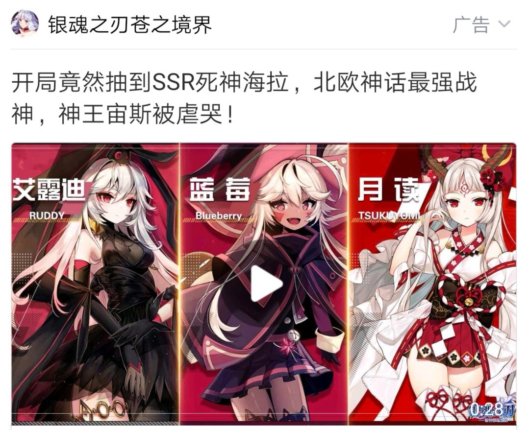 如图,游戏名为《银魂之刃之苍之境界》的游戏中使用了新版蓝莓与艾露迪的图片作为游戏宣传图,并将广告在QQ空间发布。
