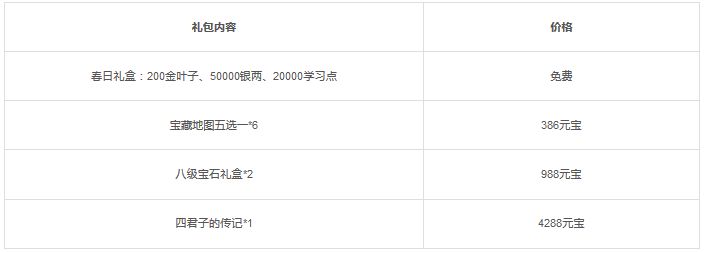 活动一:活动期间将限时上架春日礼包,礼包内容如下: