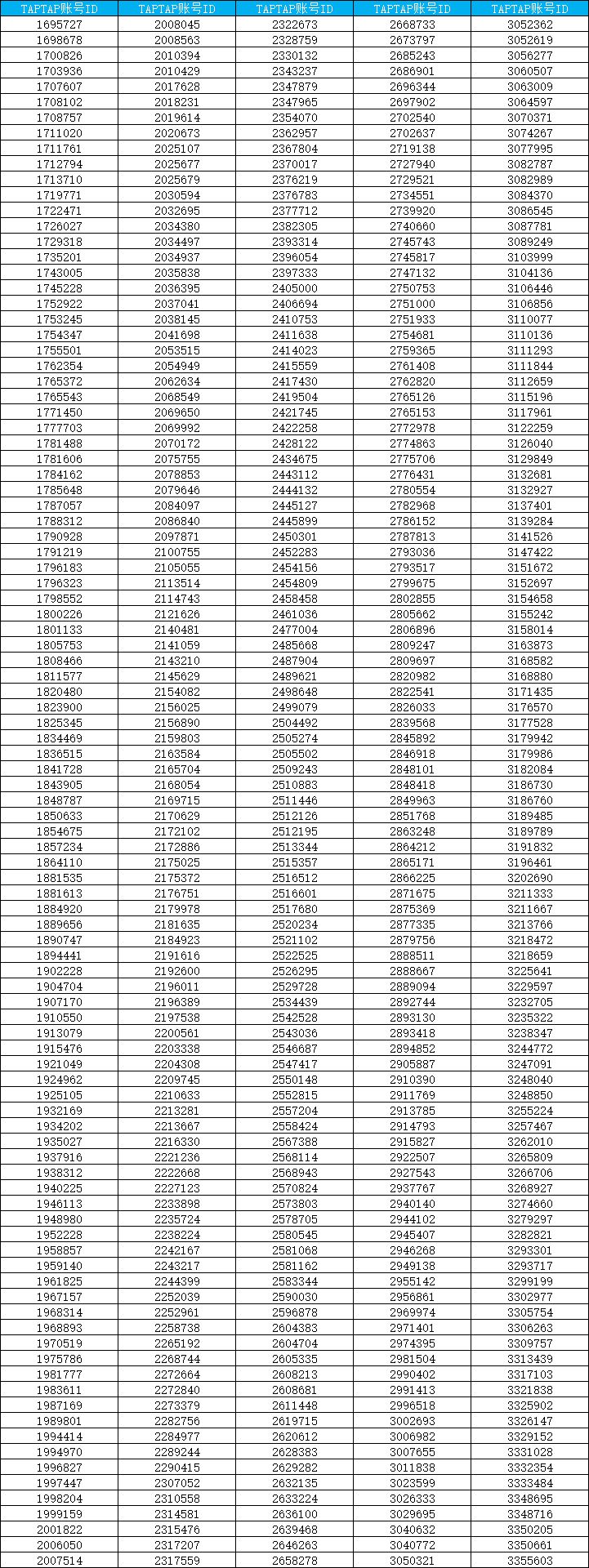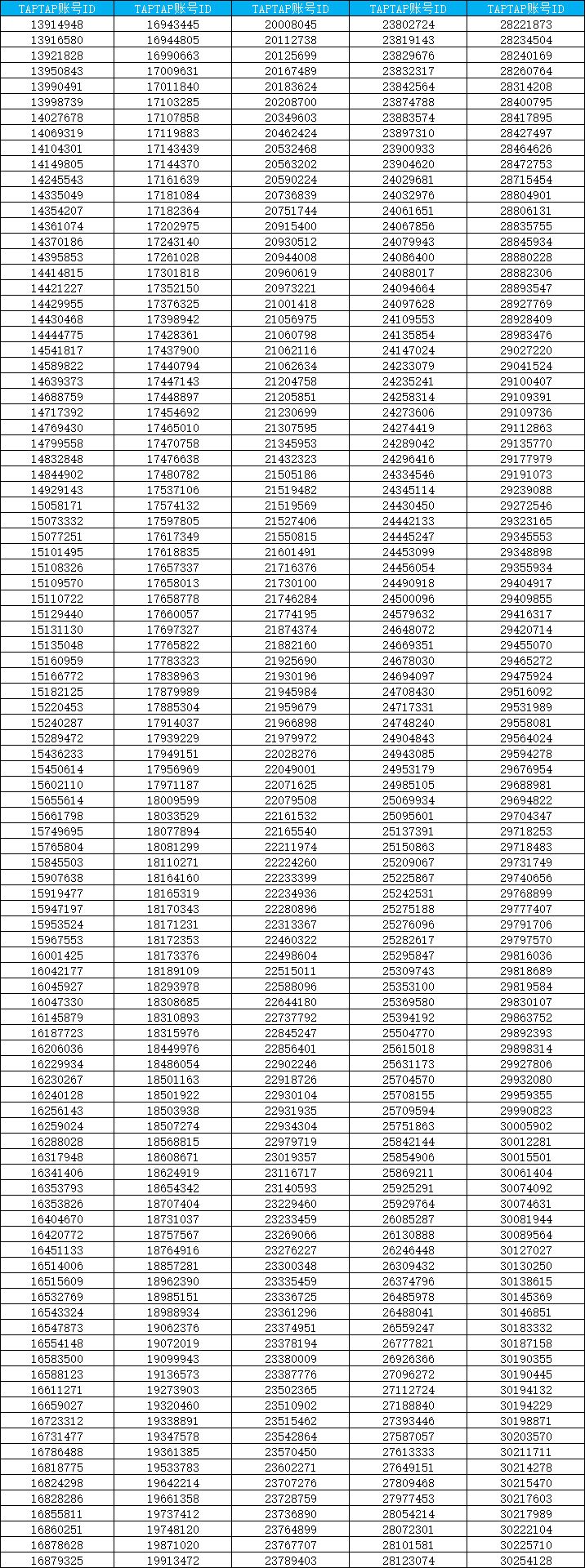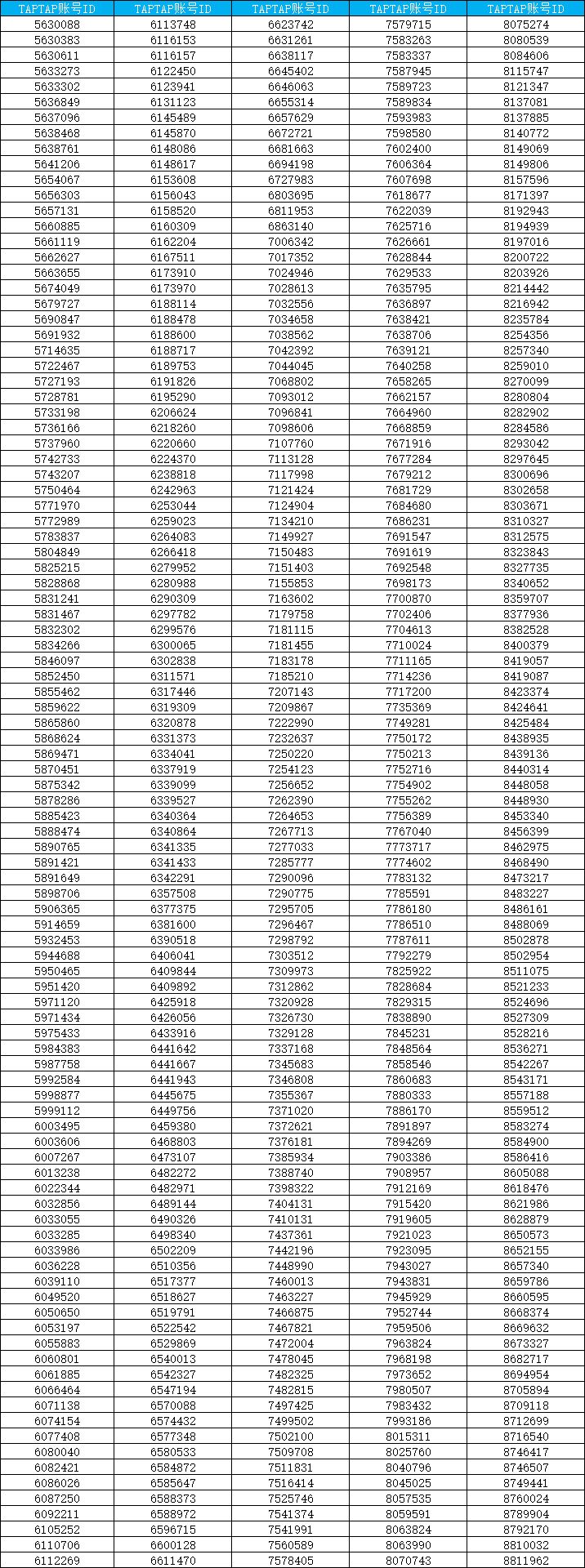 太长系列不看?或者想查找自己的TAPTAP账号ID是否在名单上,建议加入官方Q群,查找群文件-自行下载查看:快捷键:“Ctrl+F”