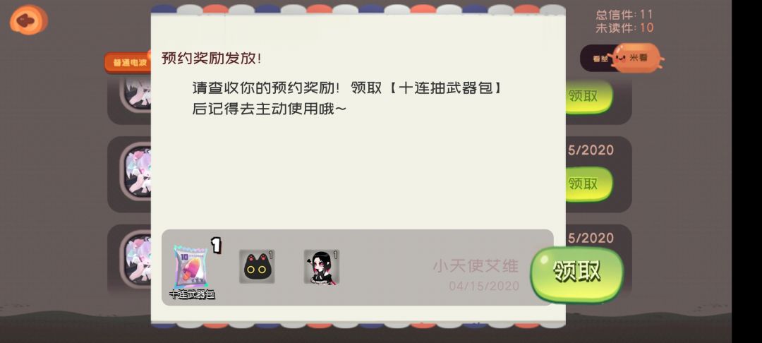 在完成第二个关卡的时候会更新邮件系统,拿到十连武器包和一个随机血型和纯度的拿拿