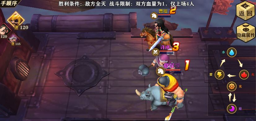 在这场战斗中敌方的骑兵速度无解,我们只能采取后发制人的方式赢得胜利,我们的优势是能上场3人。这场战斗获胜的方式很简单,我们只需要采取人墙的战术,在前排放上两个武将,再后排也放上俩就能轻松获胜。
