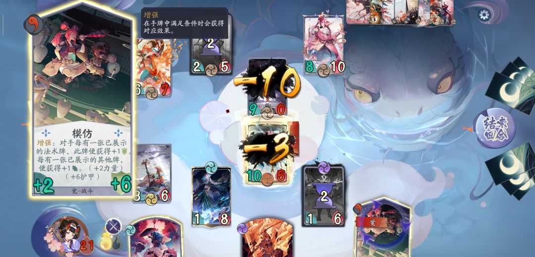 依靠前期海坊主和青坊主的双奶苟住前期,同时青坊主被动随机打1有时候也能起到补刀的作用。尘刃、棒球炸弹、水龙卷的优质单解,同时棒球炸弹和水龙卷在中后期也能打出巨额单体伤害,利用海坊主被动加成护甲以及觉看牌后的+2,在对局中都能有效的解场,同时对局中养兵佣用作后期输出。今天下午琢磨出的套路(因为抽了两张觉ssr很无奈)。个人认为应该优先升觉,毕竟觉是整套整容的思路,灵视的对对手打2己方回2在中期是很好的耗血手段