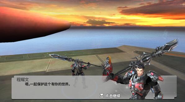 夕阳下两个人互诉衷情的经典动画场面,皇子程耀文与女神一起发誓,保护这个美好的世界。