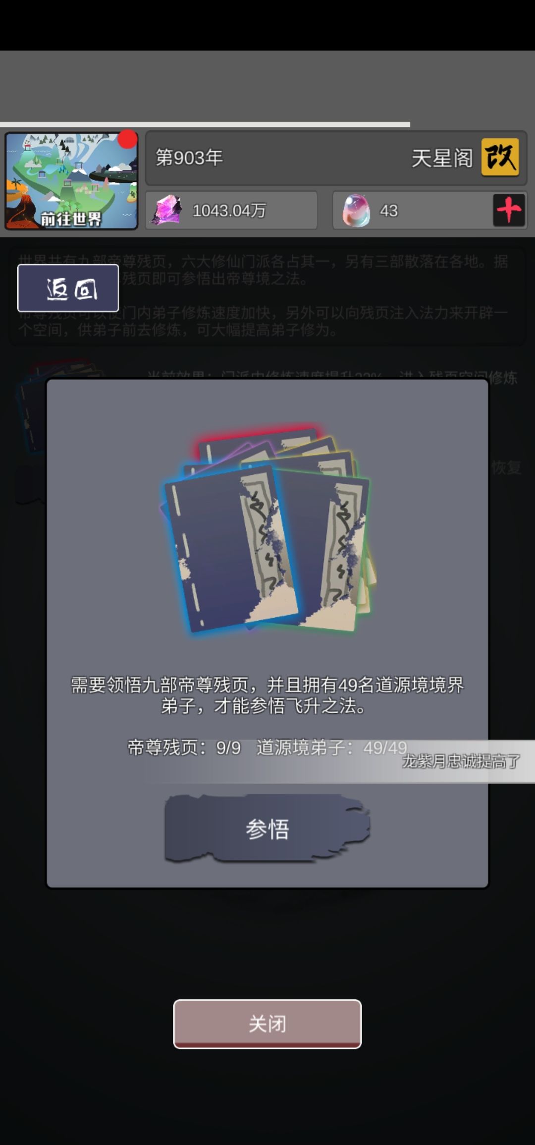 因为是第一次档,所以走了很多弯路导致我在600年的时候就在等49个弟子升天。直到900年才升天。主要就是 悉心教导 按钮在400年左右才发现他的作用。。这是个人第一次玩的经验,不喜勿喷,谢谢。