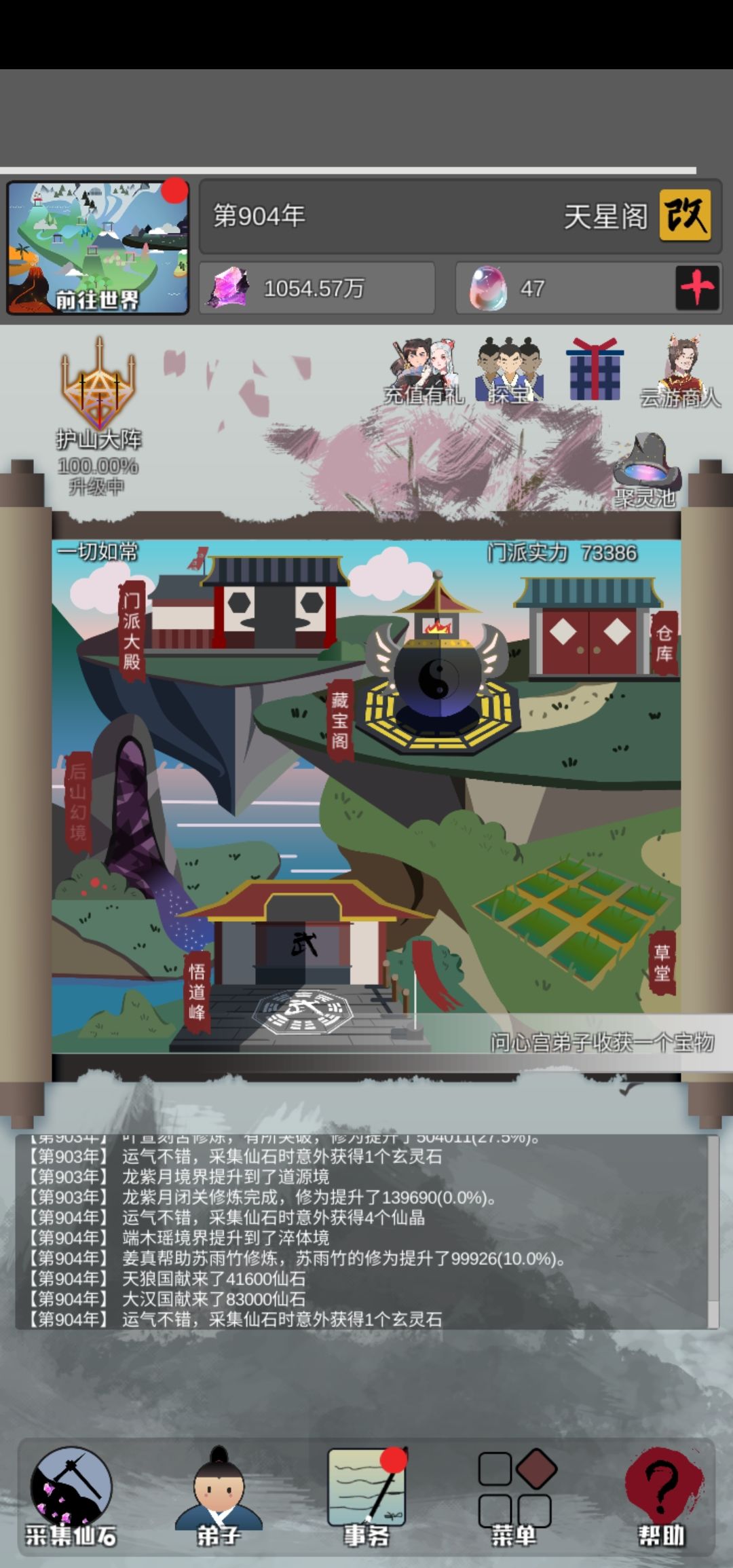 11.入室弟子,最好是重点升级的弟子跟他入室,这样可以在使用 悉心教导 等。可以提高经验获得率。结档后,你还能继续玩,但是49个升天的弟子就没了,这是结档后的图片,只有50个弟子了。然后你开新档的话,会吧上个档获得仙晶进行继承。我开了个档看了发现是1600,有可能是我看广告获得的晶石和挖矿等自动获得的晶石。打鲲的晶石不算入其中因为鲲获得的远超1600