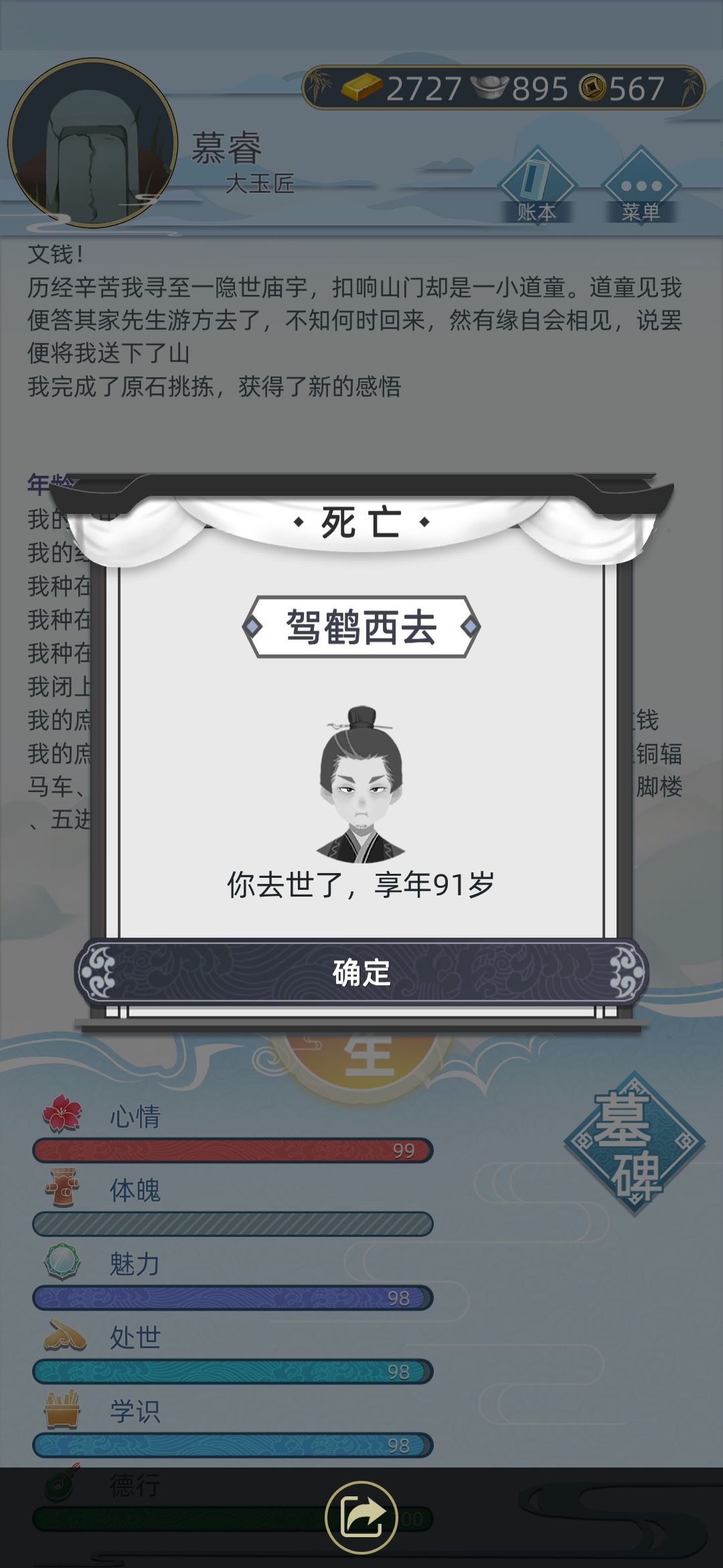 打工玉雕最赚钱,当官儿最轻松最好玩儿,种地暴富,买黄土地多种西瓜🍉,第一次不要全卖掉,留2石可以看到明年是涨是跌,其它也是一样,再选合适的种植,一直落地,你也能富甲一方了。房子可以买来之后也能投资,比商行的贵就证明赚了,要正规出售,典当容易触犯律法,会蹲大牢的。特殊情况:在客栈有几率刷到 暗门(我也没进去过)杂市有枯井(也没进去过)深山除了有狩猎和寻找方士还有黑市一般方市给的丹药都是假的,会得病,黑市赌大小见好就收,总共100点体魄,没了就死了,建议遗嘱要弄好,以防万一。娶妻生子看长相看属性,有钱之后可以去甜水巷选,心动值满了用钱赎出来,再到媒人那里成为知己就可以了。